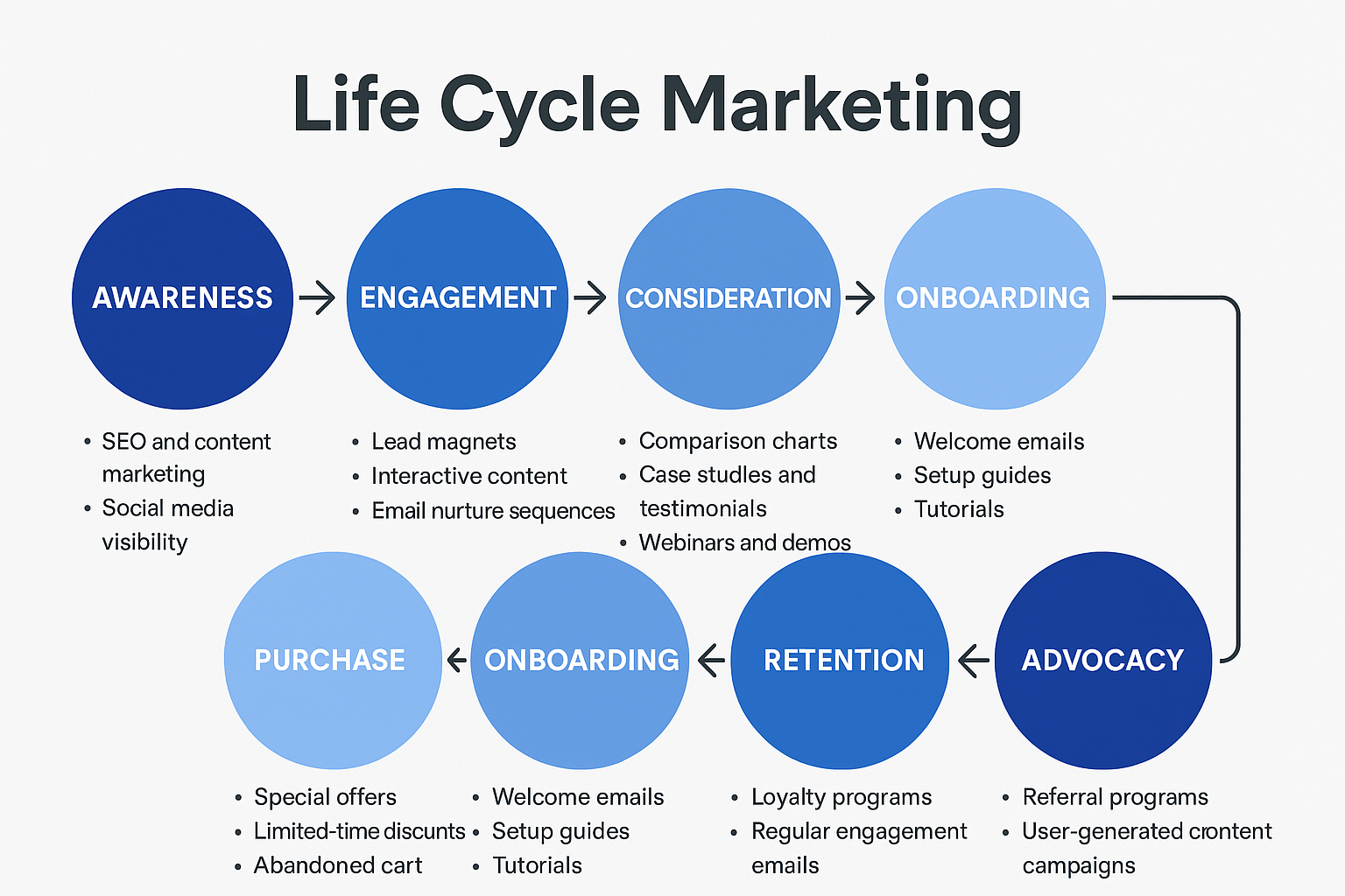 Instead of thinking of marketing as a one-time transaction — "run ad → make sale" — life cycle marketing treats each customer like a relationship, nurturing them at every stage of their journey. The goal? Maximize lifetime value, loyalty, and advocacy.